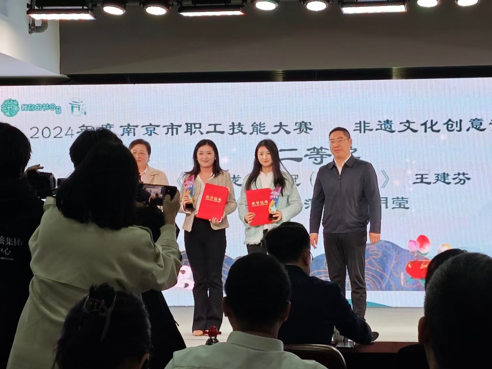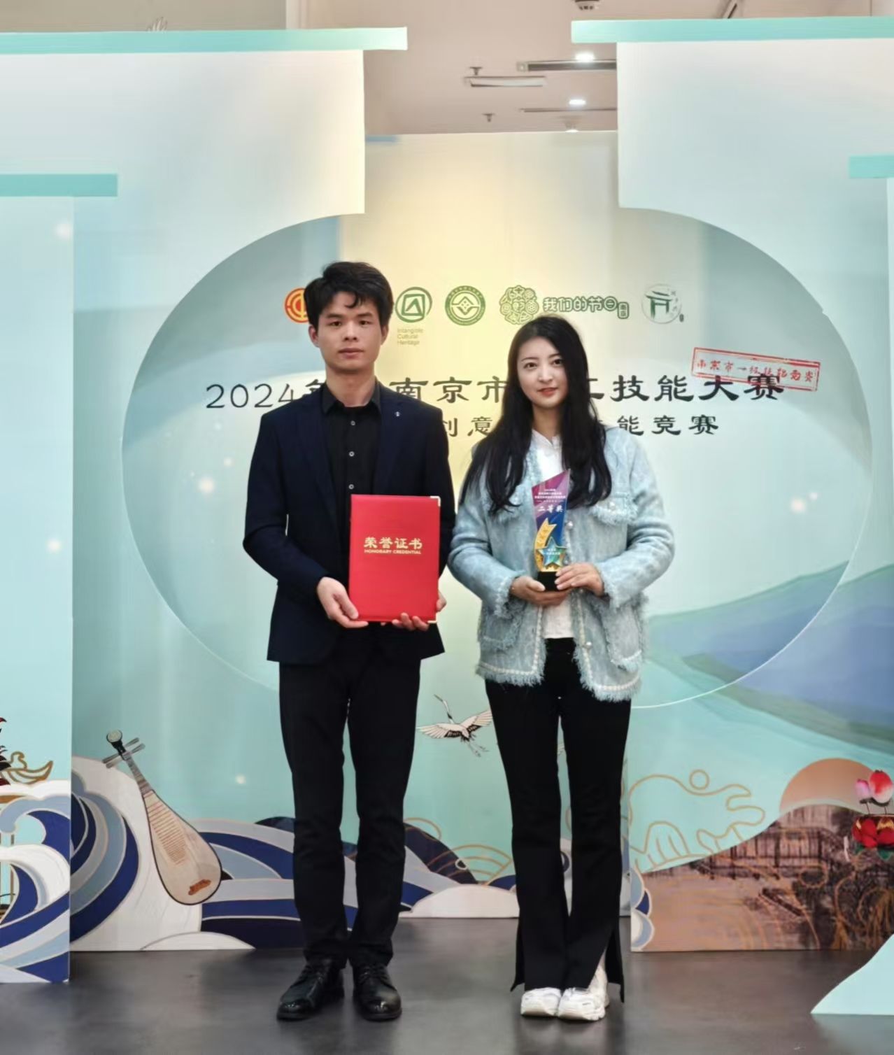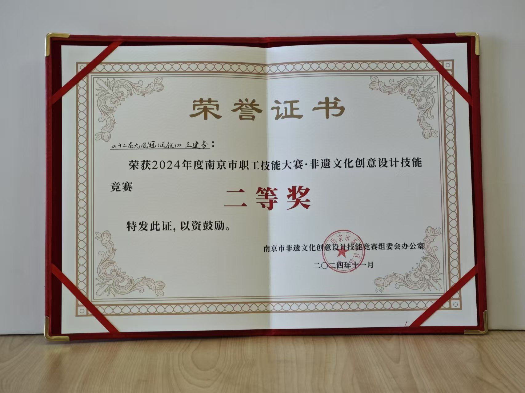 2024年度南京市职工技能大赛非遗文化创意设计技能竞赛,决赛于2024年11月8号举行,来自888集团官网的 “三生令原创国风发冠”项目,通过初赛、复赛的激烈角逐,进入到决赛,品牌创始人马永强、王建芬携带原创产品非遗点翠复原款“十二龙九凤冠(凤仪)”参加决赛,荣获二等奖。