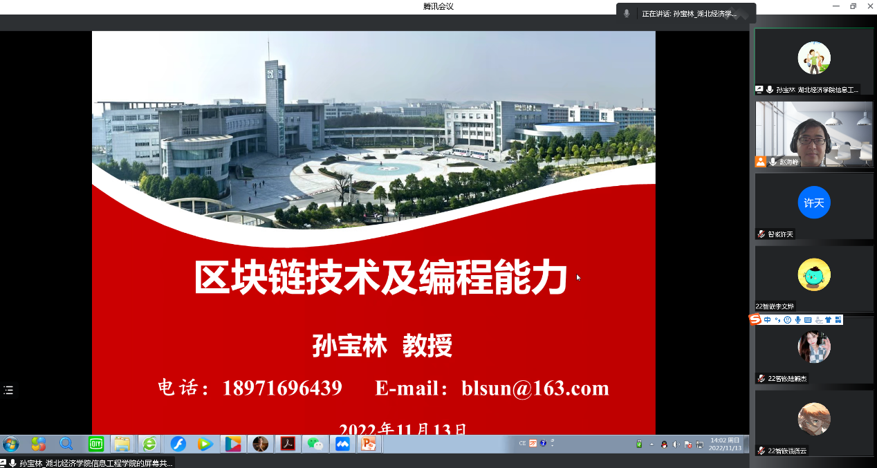 为了提高我院学生的学习兴趣和学术创新能力,拓展同学们对新一代信息技术的认知,应软件学院曾岳院长邀请,湖北经济学院信息工程学院孙宝林教授于11月13日下午2点在线上作“区块链技术及编程能力”的学术讲座。22级智能科学与技术与智能科学与技术(嵌入式培养)专业全体新同学参加了讲座,讲座由智能科学与技术系主任赵海峰老师主持。