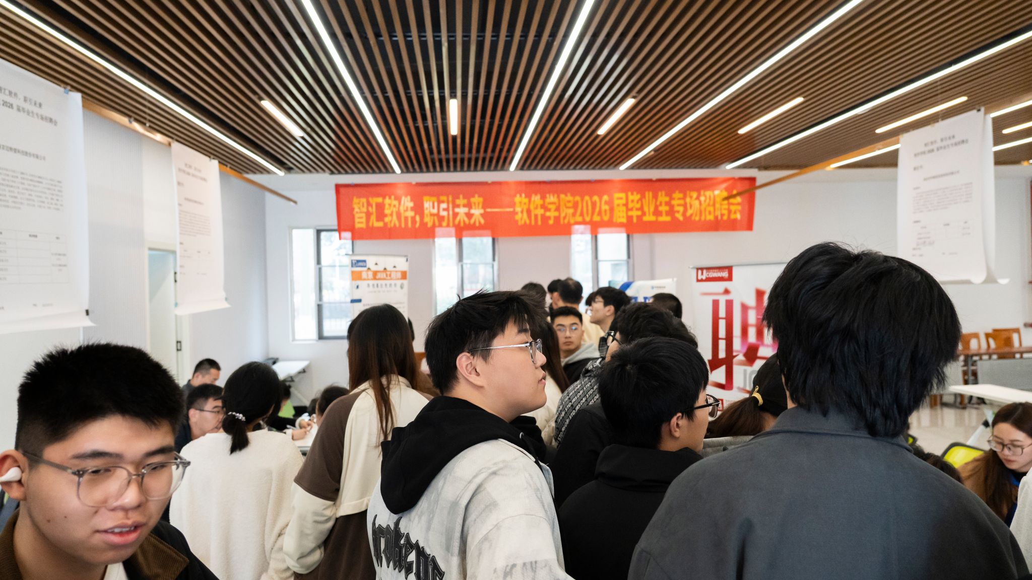 为搭建校企人才对接桥梁,助力毕业生高质量就业,2026年3月26日下午软件学院2026届毕业生专场招聘会在江宁校区大学生活动中心一楼招聘大厅圆满落幕。本次招聘会邀请南京联迪、南京迈特望等15家优质企业参会,涵盖软件研发、信息技术等多个领域,为毕业生提供了丰富就业选择。